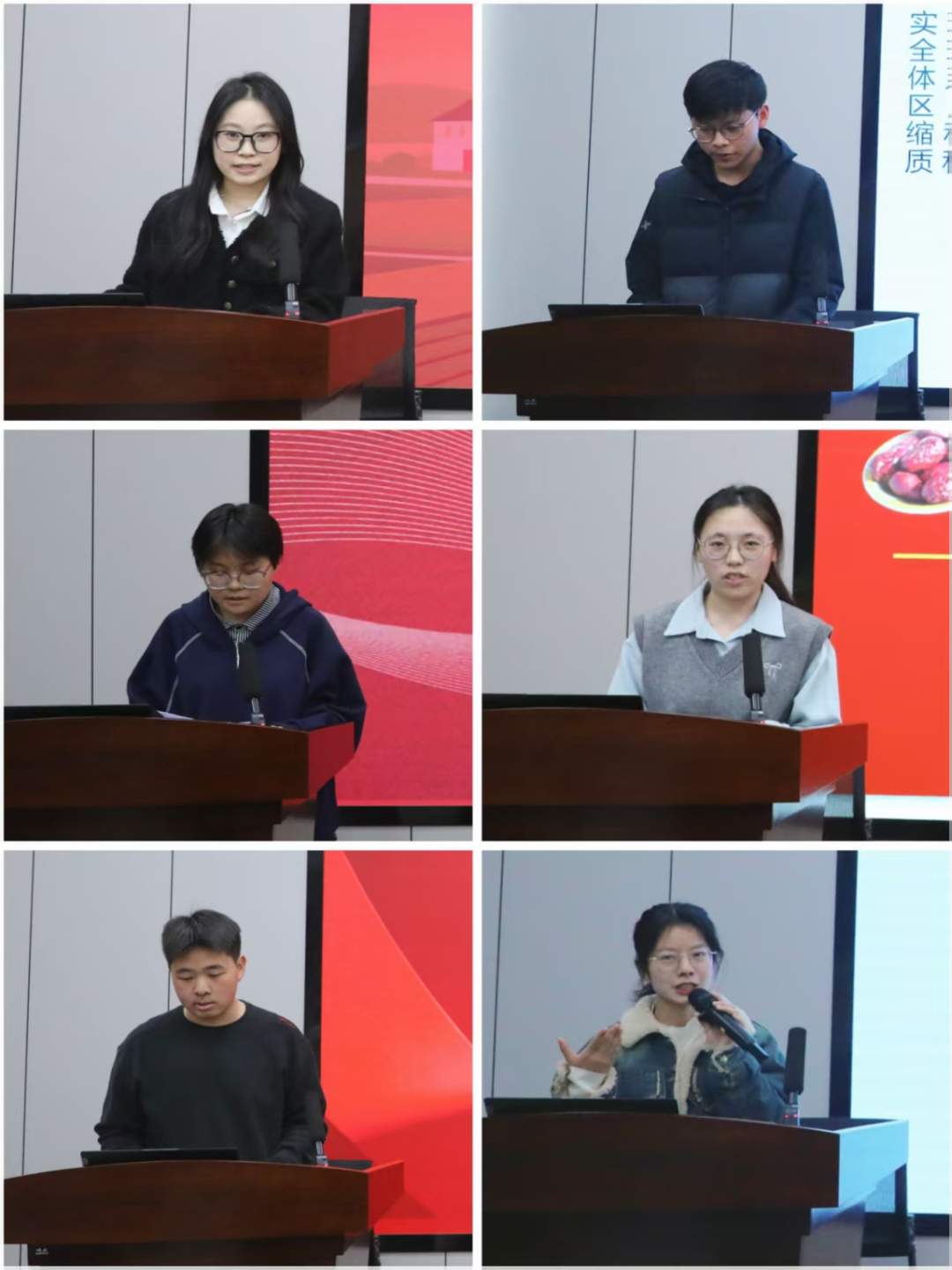 在成果展示会环节,6位获奖同学代表分别围绕“党建引领共同富裕的实践路径与经验启示”“东莞产业升级与村镇工业区变迁调查报告”“圪垯上村党建引领基层治理调查报告”“运城市稷山县板枣专业合作社联合社调研报告”“延安人民对延安精神认知与传承现状的调查报告”“关于自贡市邮政快递业发展现状的实践调查”等主题进行了交流展示,详细阐述了调研过程和主要发现,分享了在实地走访、数据收集、报告撰写等环节中的经验与思考。