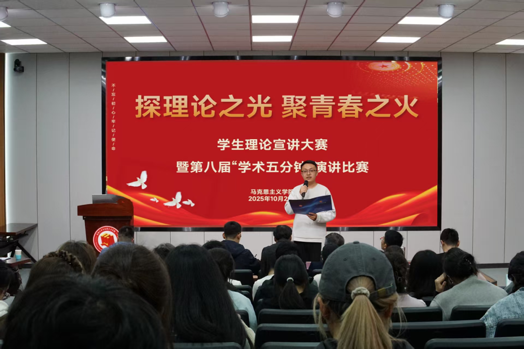 为深入学习宣传贯彻党的二十届四中全会精神,提高学生理论阐释能力和学术研究水平,10月29日下午,我院在卓越报告厅成功举办“探理论之光 聚青春之火”学生理论宣讲大赛暨第八届“学术五分钟”演讲比赛。学院党委副书记宋璐鹏、副院长赵瑞林、副院长李可、副教授石磊、郭建斌、冀鹏、团委副书记许柯以及教学管理秘书武倩茹老师出席比赛并担任评委。2025级全体研究生、本科生观看比赛,比赛由研究生会学研部刘志彬同学主持。