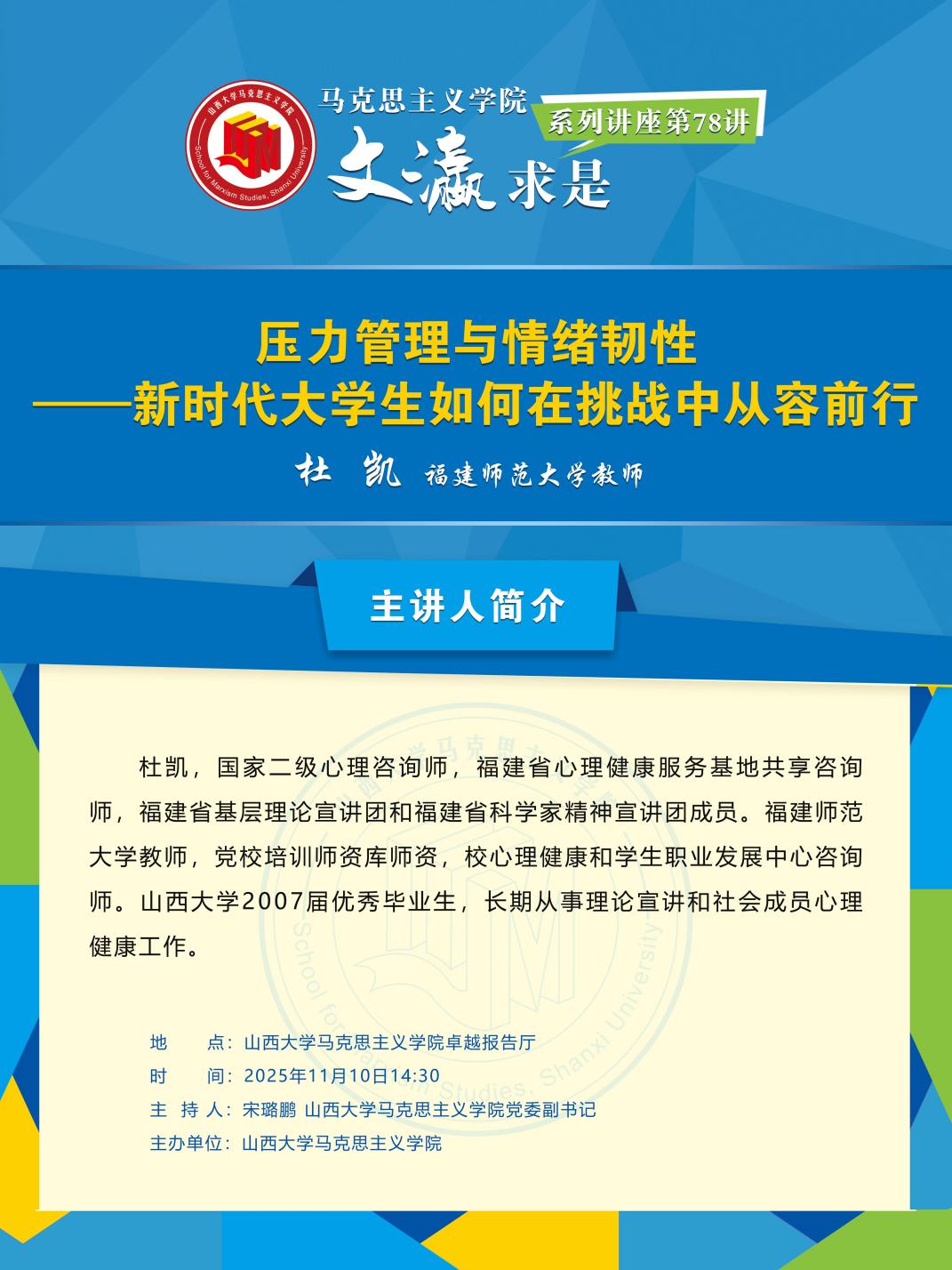 为提升学生应对压力和挑战的能力,营造积极健康的学习成长氛围,11月10日下午,我院“文瀛求是”系列讲座第78期邀请福建师范大学杜凯老师在卓越报告厅作“压力管理与情绪韧性——新时代大学生如何在挑战中从容前行”主题讲座。学院各年级学生及辅导员老师现场听讲。讲座由党委副书记宋璐鹏主持。