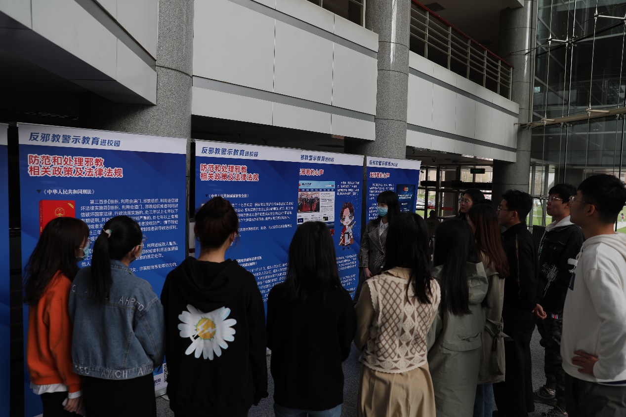 最后,全体同学在文科楼一层参观学校组织的“反邪教警示教育进校园”展览。