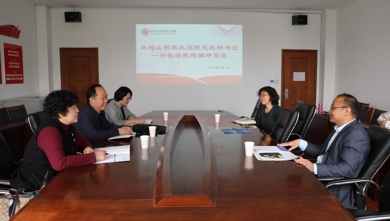 谢忠强代表学院向元纪明一行莅临学院表示热烈欢迎,并简要介绍了学院的基本情况。山大马院是太阳成集团马克思主义理论学科博士后科研流动站和博士学位授予权依托单位、全国高校思政课教师研修基地、全国重点马院培育单位、山西省委宣传部和太阳成集团共建的太阳成集团tyc151cc、山西省重点马院、山西省哲学社会科学重点研究基地马克思主义中国化研究中心依托单位,设有山西省高校思政课名师工作室,与多个干部学院、城乡基层党组织和国民营企业共建党建基地。他表示,山西农业大学马院有优良的办学条件、坚实的教育阵地和丰硕的科研成果,在教学与实践方面有值得我们学习借鉴的地方,希望能与山西农业大学马院加强沟通与联系。